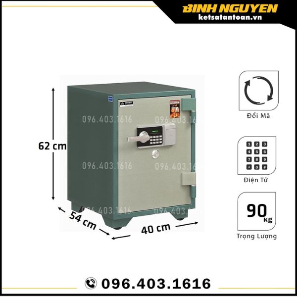 Bề mặt sản phẩm được phủ bột chống cháy kết cánh cửa thiết kế 3 lớp đúc đặc, mang lại khả năng chống cháy hiệu quả trong vòng 2 giờ ở 2000 độ C. Không gian bên trong két thiết kế rộng rãi, chứa được các tài liệu và giấy tờ cần thiết. Người dùng dễ dàng thao tác mở khóa bằng khóa điện tử hiện đại.