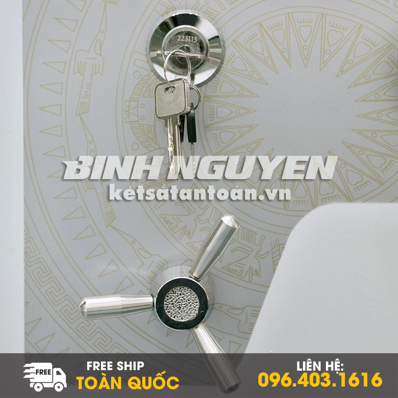 - Hệ thống chốt an toàn gồm 10m thanh, kích thước lớn được làm từ inox đặc siêu cứng, bố trí bốn phía xung quanh cánh két, đâm sâu vào thân két cực kì chắc chắn chống trộm tuyệt đối.