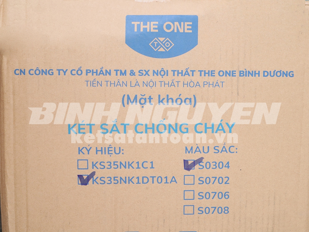 Bên ngoài vỏ thùng đựng két sắt được in đầy đủ thông tin gồm mã sản phẩm, đánh dấu loại khóa, màu sơn, logo Hòa Phát hoặc The One. Và được in rõ nét chú thích dòng chữ “Tiền thân là nội thất Hòa Phát”.