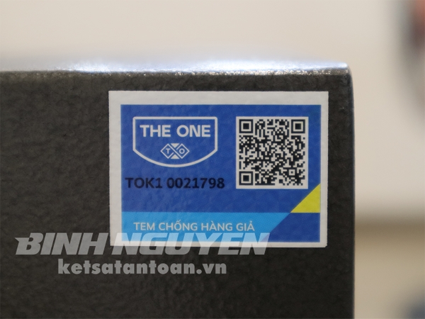 Tem thương hiệu của két sắt thiết kế tem dán nilon và có in rõ nét mã sản phẩm, được đặt ở góc dưới bên phải két sắt. Khách hàng dễ dàng quan sát và nhận biết tem hãng tiện lợi, thực hiện công cuộc check sản phẩm nhanh chóng.