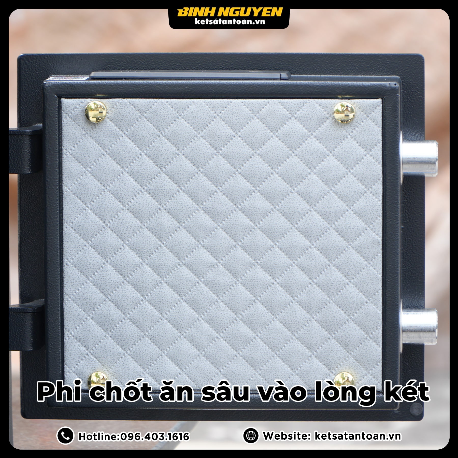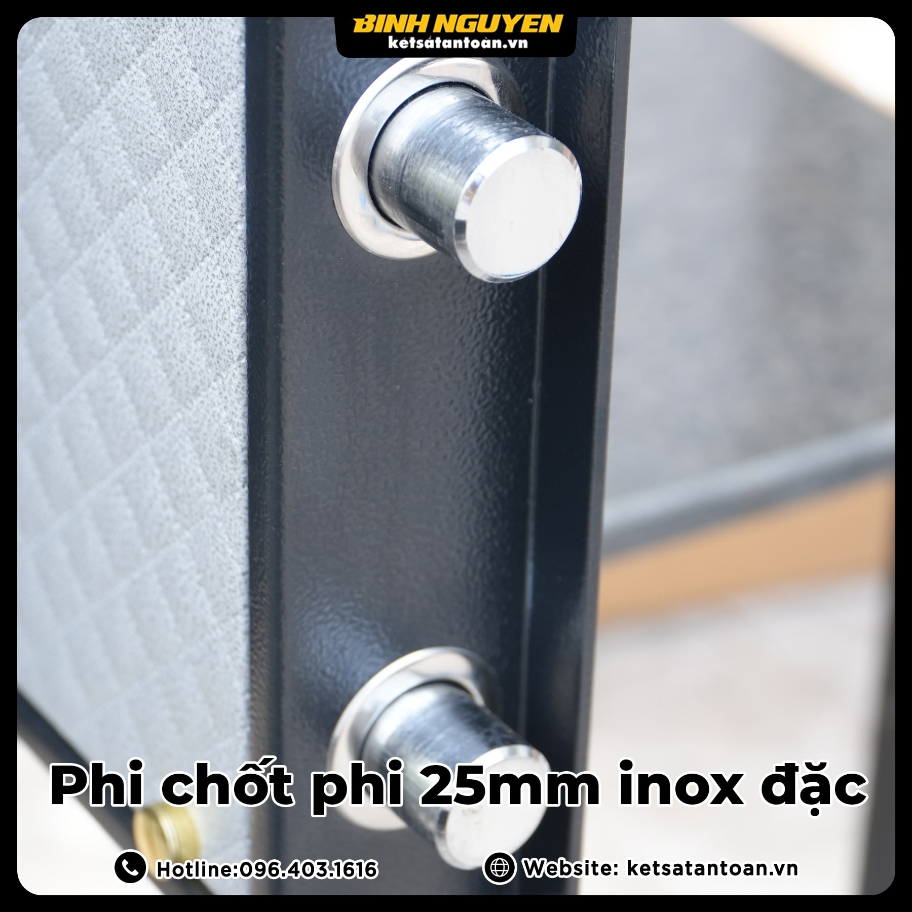 Chốt khóa inox phi 25mm đúc đặc, mạ Crom sáng bóng: Ăn sâu vào thân két, khóa chặt 4 điểm, ngăn hoàn toàn hành vi cạy phá hoặc khoan thủng.