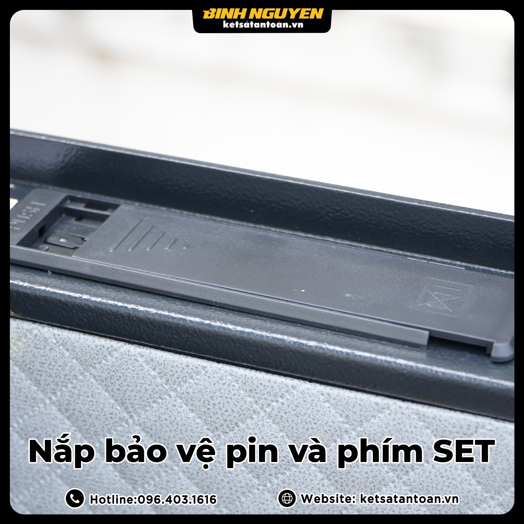 Nắp bảo vệ pin và phím SET thông minh: Thiết kế ẩn phía trong cánh cửa giúp ngăn va đập và truy cập trái phép, bảo vệ toàn bộ hệ thống điện tử ổn định, bền lâu.