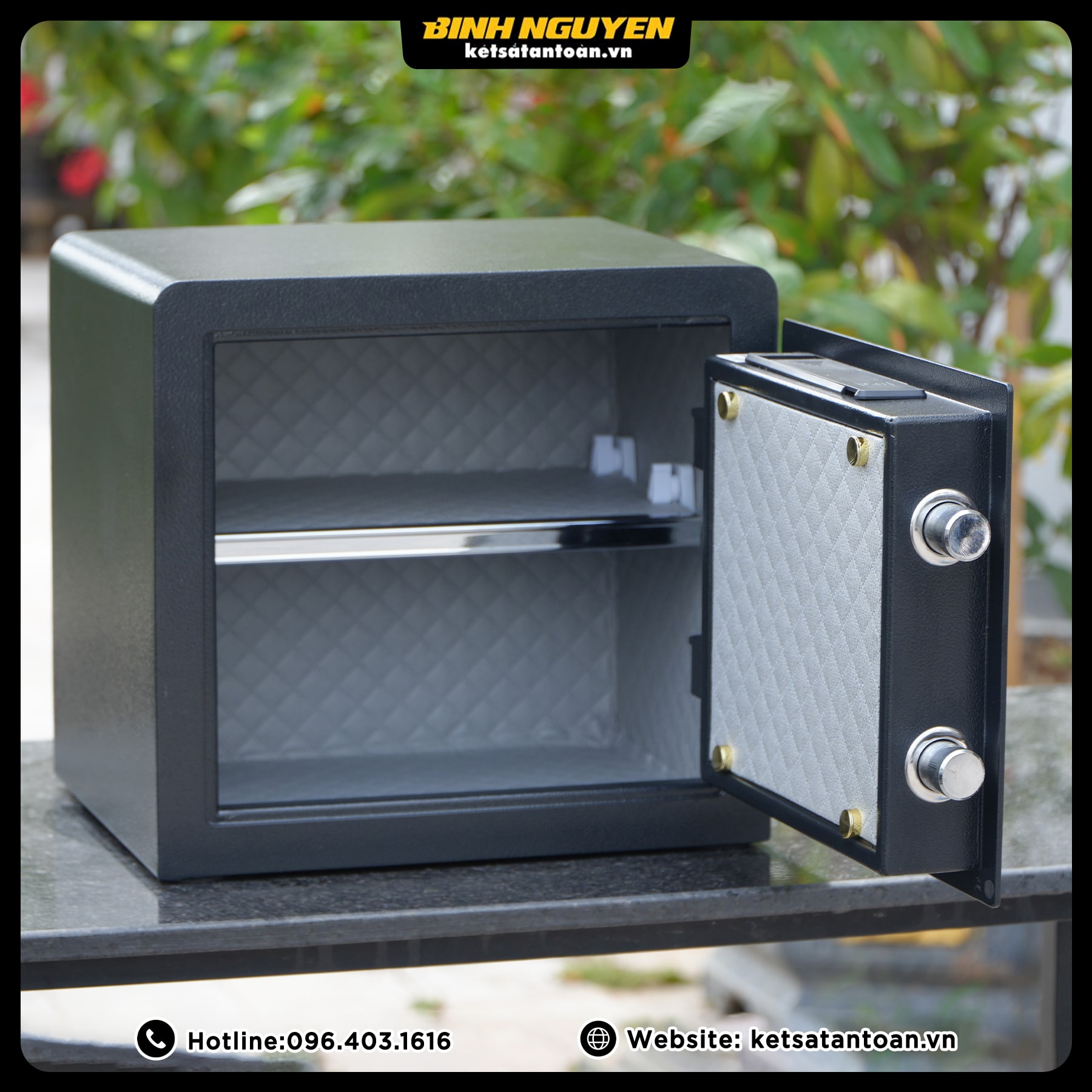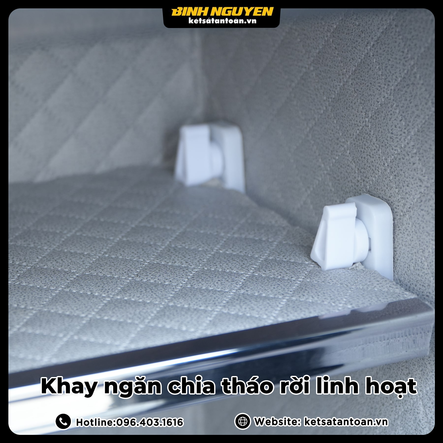 Nội thất bọc da kim cương cao cấp: Không chỉ sang trọng mà còn chống trầy xước, chống ẩm, cách nhiệt tốt, giúp bảo quản vàng, tiền, giấy tờ và trang sức an toàn. Không gian bên trong chia 2 tầng khoa học, tối ưu diện tích chứa và sắp xếp tài sản dễ dàng.