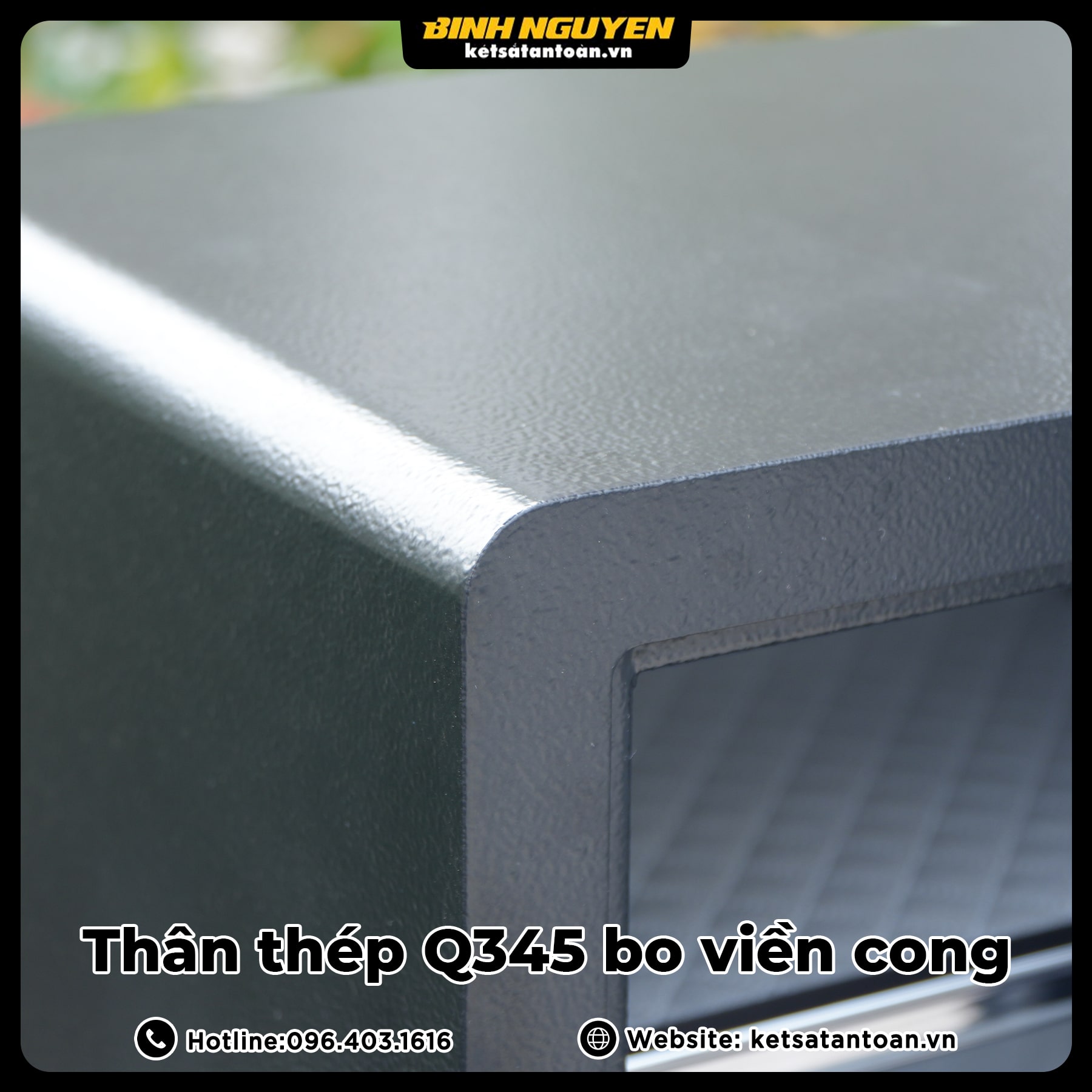 Thân két đúc liền khối từ thép Q345 vi-carbon: Sử dụng loại thép cao cấp thường dùng trong cầu treo và công trình lớn như tháp Eiffel, mang đến độ cứng vượt trội, chống cạy phá, chống cháy và chịu lực cực tốt. Cấu trúc nguyên khối không mối hàn giúp két bền bỉ qua hàng chục năm sử dụng.