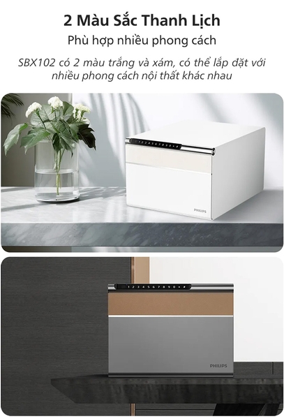 Philips SBX102 có hai tông màu trắng và xám, phù hợp với nhiều phong cách nội thất. Màu trắng thanh lịch tạo nên không gian sáng sủa, trong khi màu xám cổ điển phù hợp với các văn phòng, phòng khách, mang lại vẻ đẳng cấp.