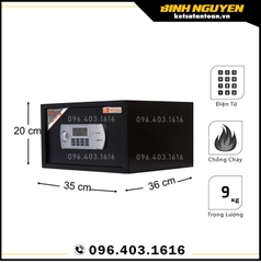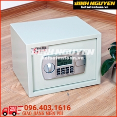 Đây là mẫu két sắt vô cùng nhỏ gọn, thích hợp với mọi vị trí trong khách sạn. Ngoại hình két sắt được phủ lớp sơn nano chống xước nên cực kỳ bền màu với thời gian. Sản phẩm được trang bị 1 bộ khóa điện tử motor xoắn tự động sau khi nhận lệnh từ bàn phím mã điện tử.