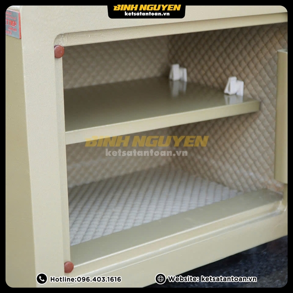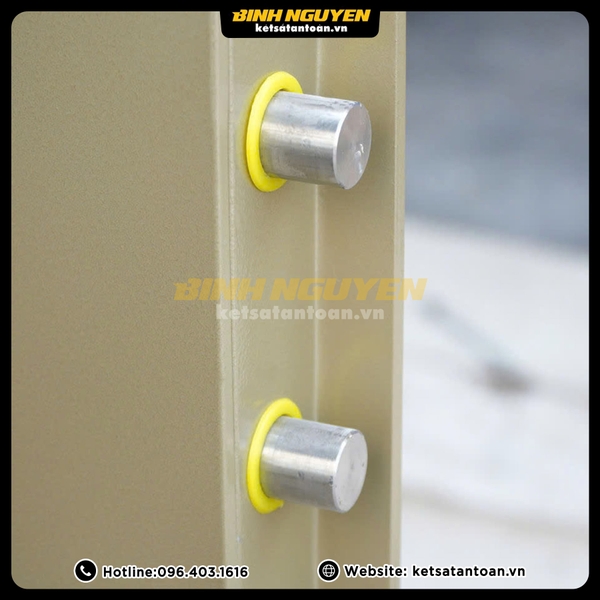 Khi két được khóa lại, hệ thống chốt thép đặc phi 25mm, to gấp đôi so với các dòng két sắt trên thị trường chỉ dùng phi 10, phi 15. Hệ thống phi sẽ ăn sâu vào thân két, khóa chặt cửa từ phía trong. Kể cả khi dùng máy khoan hoặc đập phá từ ngoài, két vẫn không bung – một lớp bảo vệ cực kỳ đáng tin cậy trong tình huống có nguy cơ thực sự.
