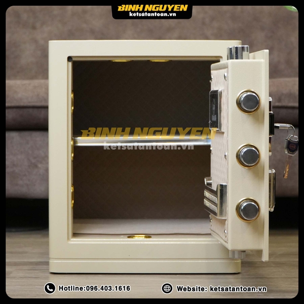 Nội thất bên trong két sắt được thiết kế đơn giản nhưng tiện lợi, giúp bạn sắp xếp tài sản một cách khoa học. Với không gian bên trong rộng rãi, bạn có thể dễ dàng lưu trữ nhiều tài liệu, tiền bạc và các vật dụng có giá trị khác.