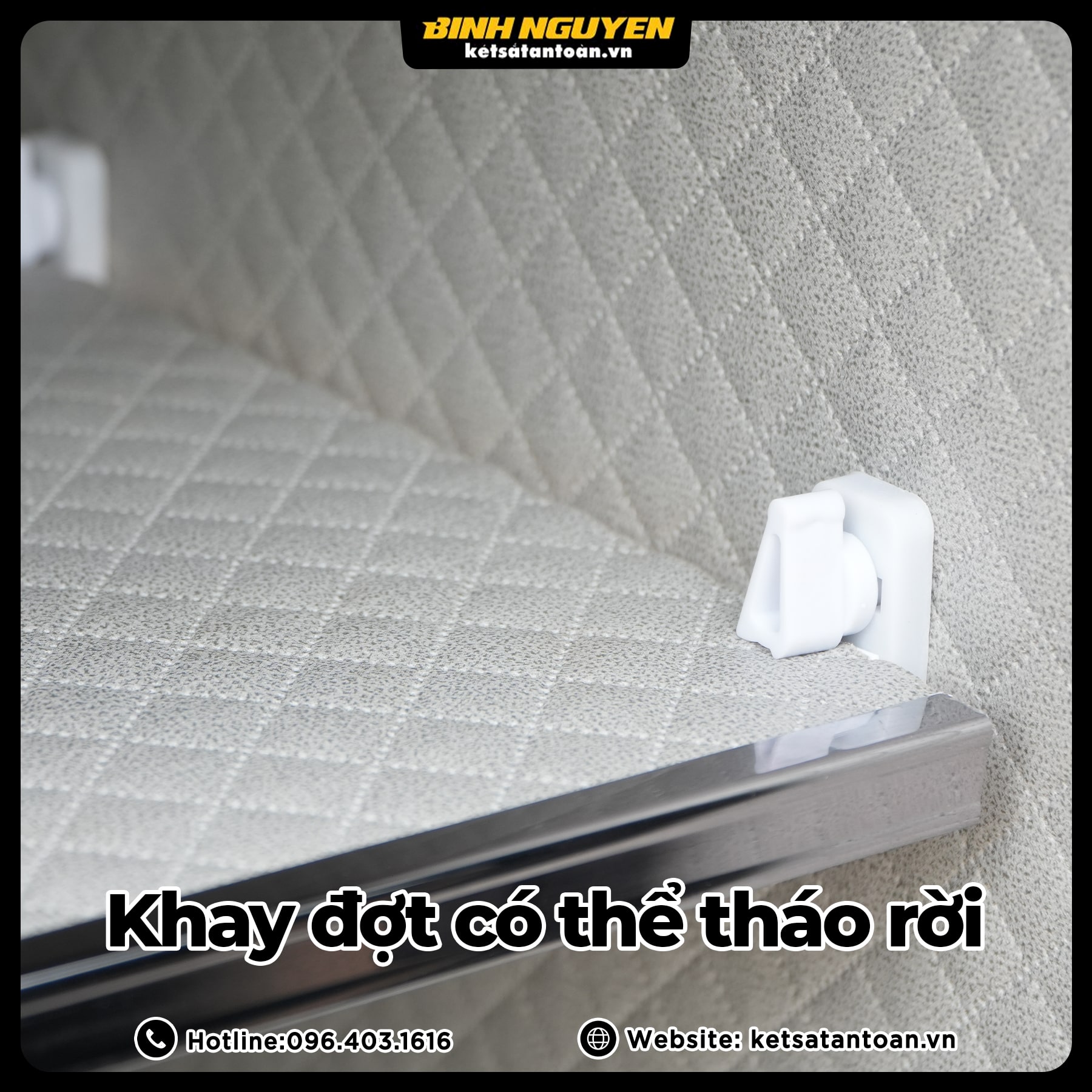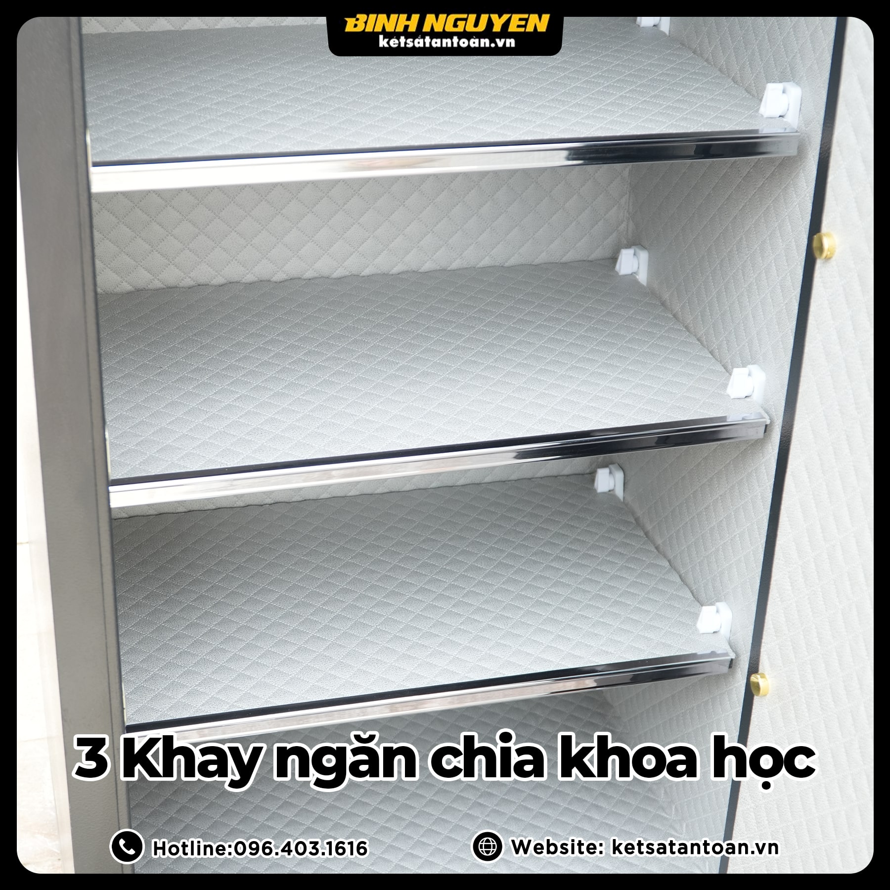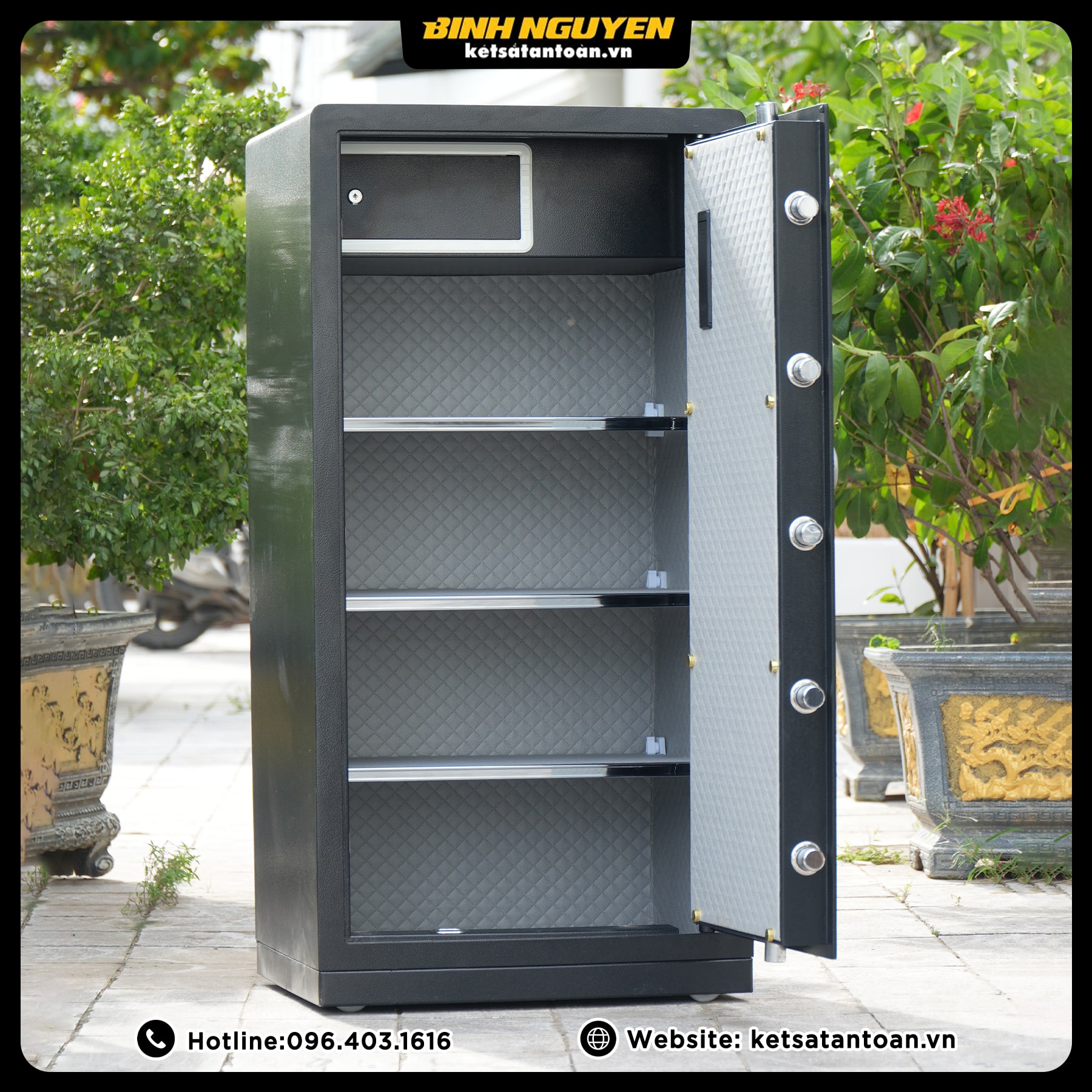 Nội thất bên trong được bọc nỉ kim cương cao cấp, mềm mại, sang trọng và có khả năng chống trầy xước. Chia thành 5 ngăn khoa học, có ngăn kéo riêng giúp sắp xếp vàng, trang sức, sổ đỏ, hồ sơ và giấy tờ quan trọng một cách gọn gàng, đẹp mắt.