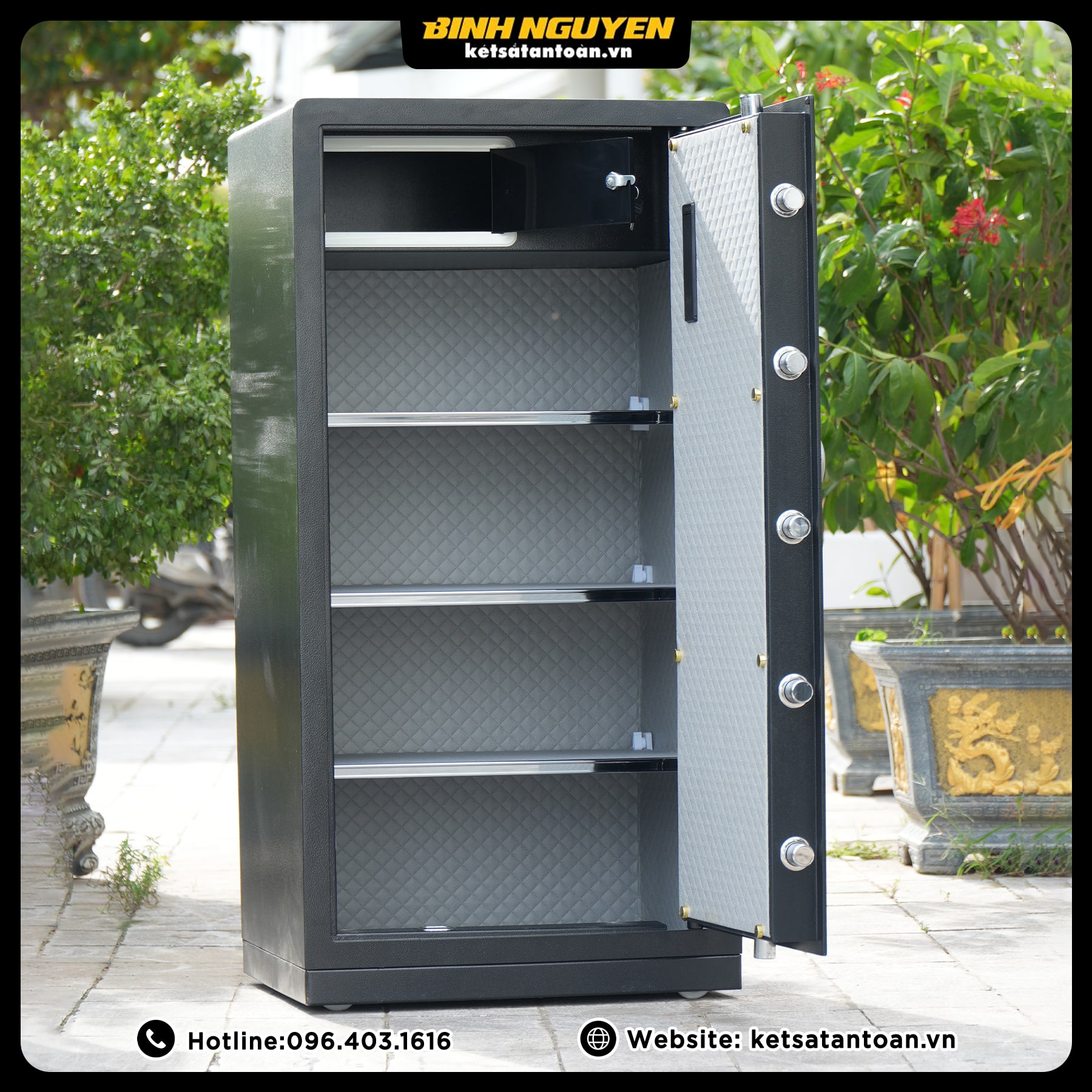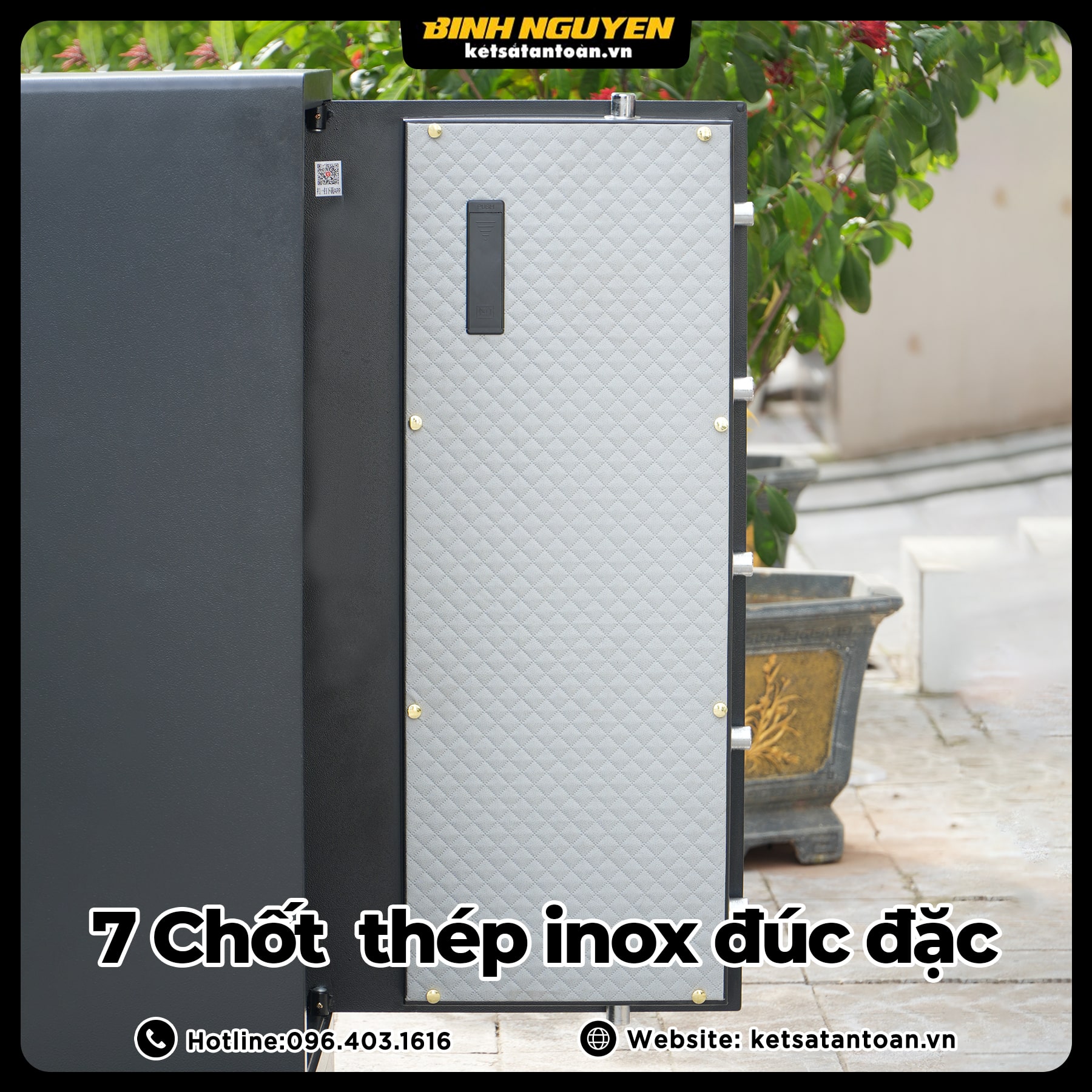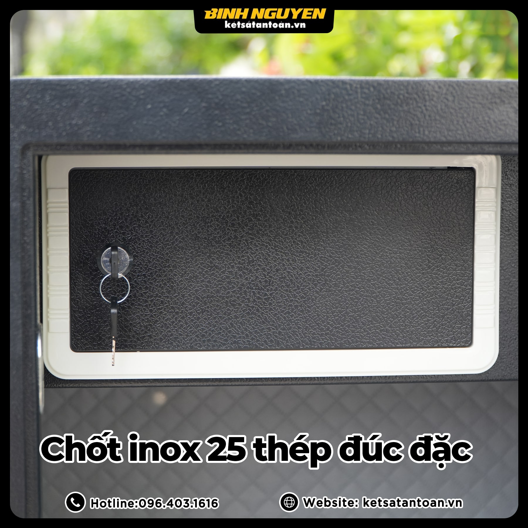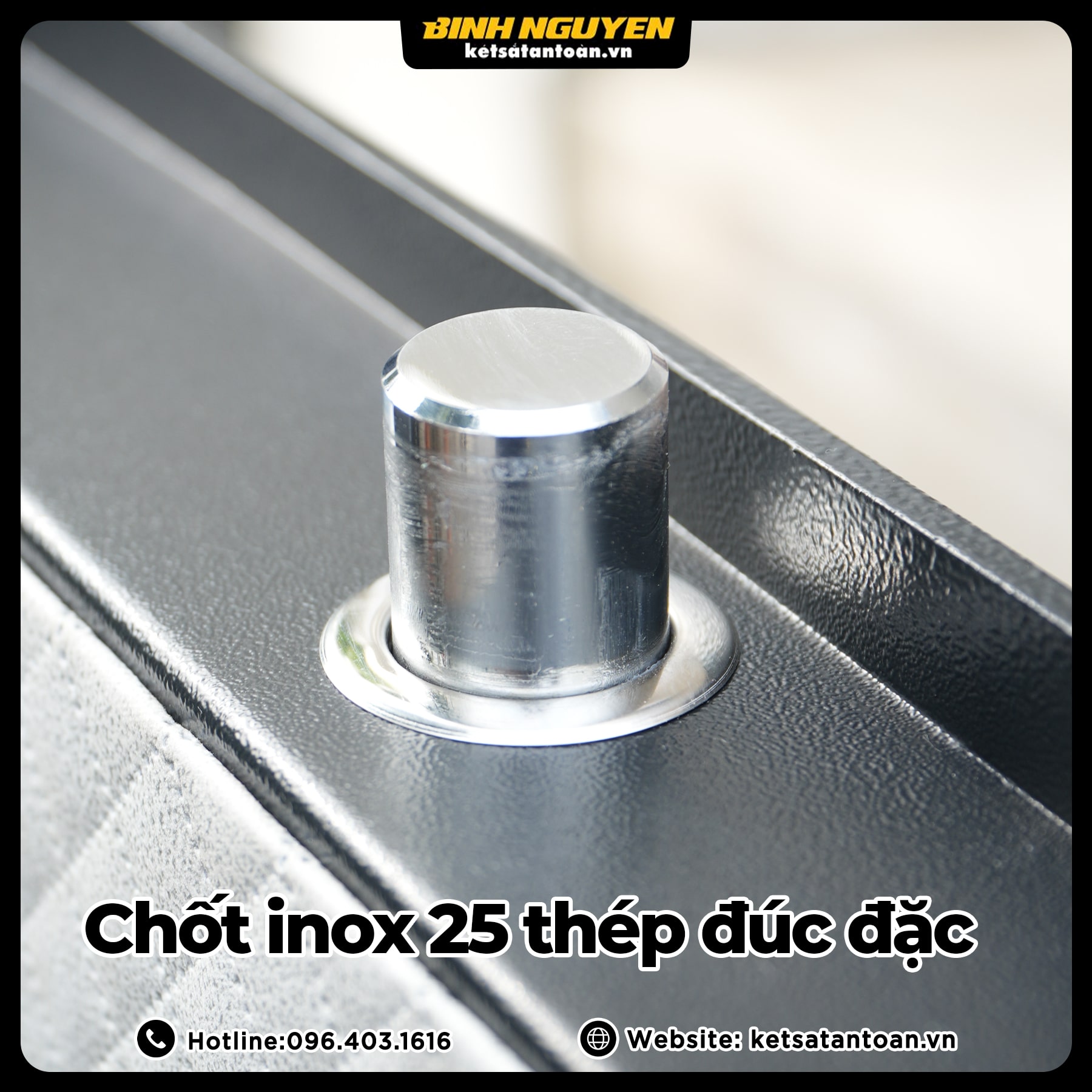 Hệ thống 6 chốt khóa inox đặc phi 25mm, ăn sâu vào thân két 3 chiều, mỗi chốt vận hành độc lập. Cấu trúc chốt này giúp két khóa chặt như bức tường thép, đảm bảo độ an toàn vượt trội và ngăn ngừa hoàn toàn các hành vi tác động ngoại lực.