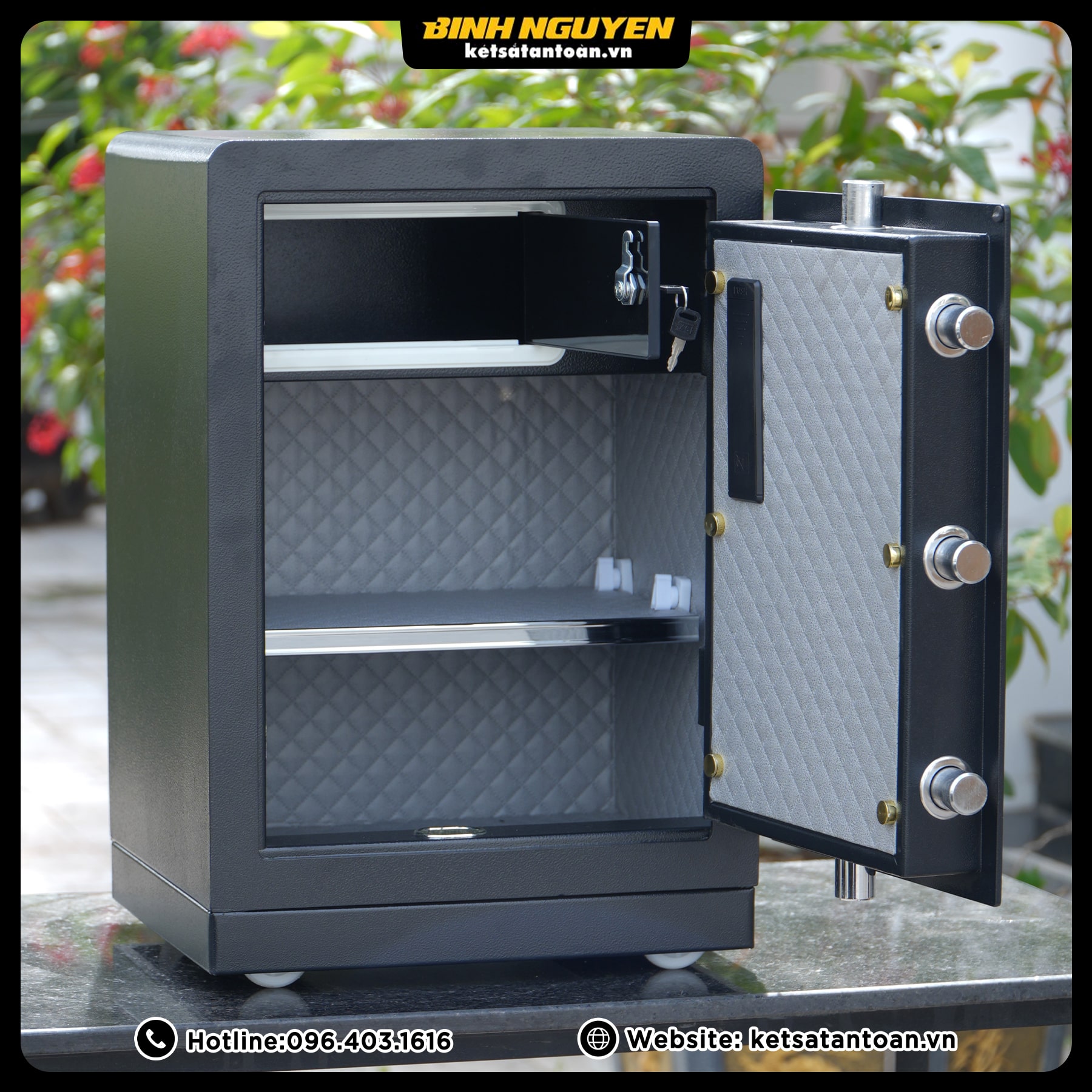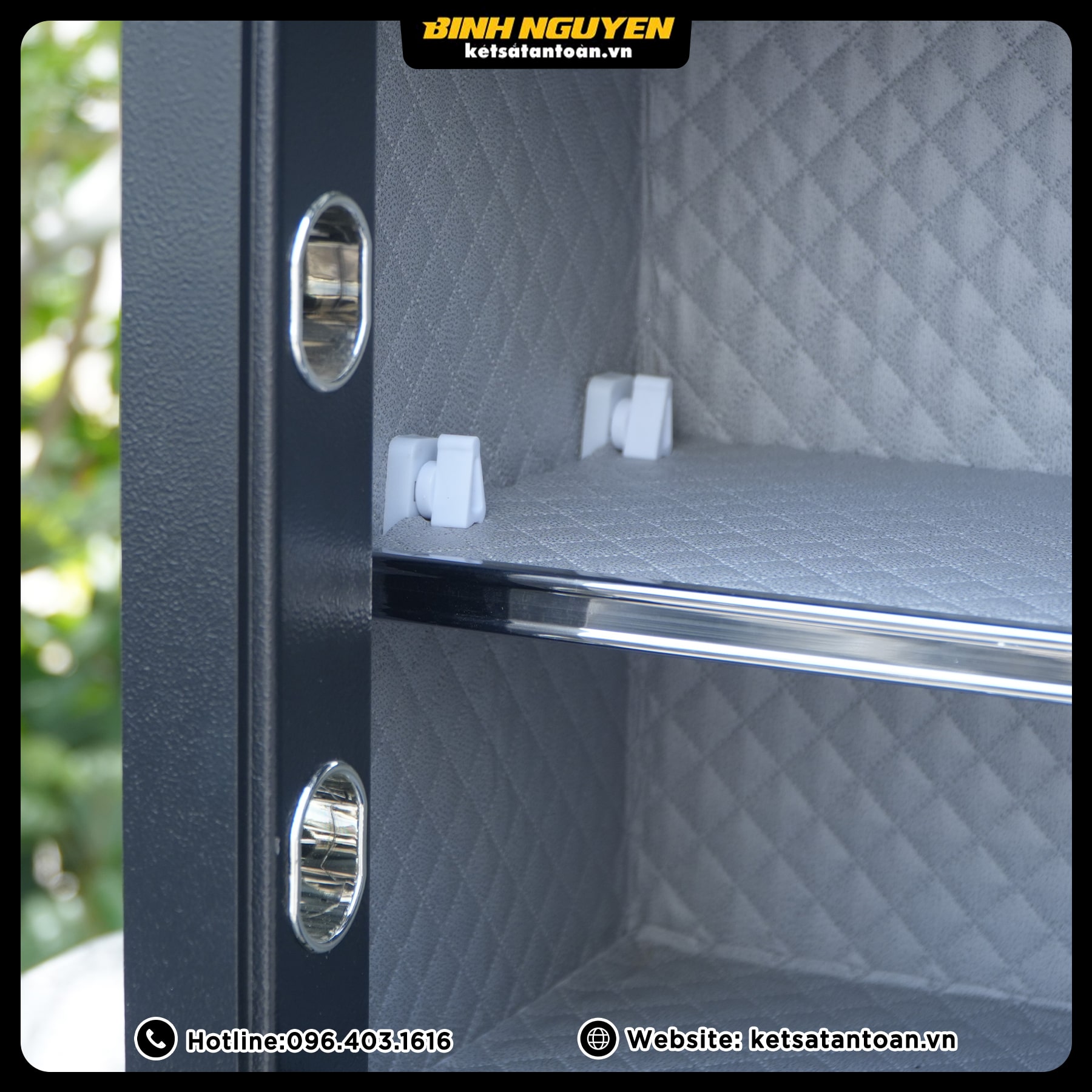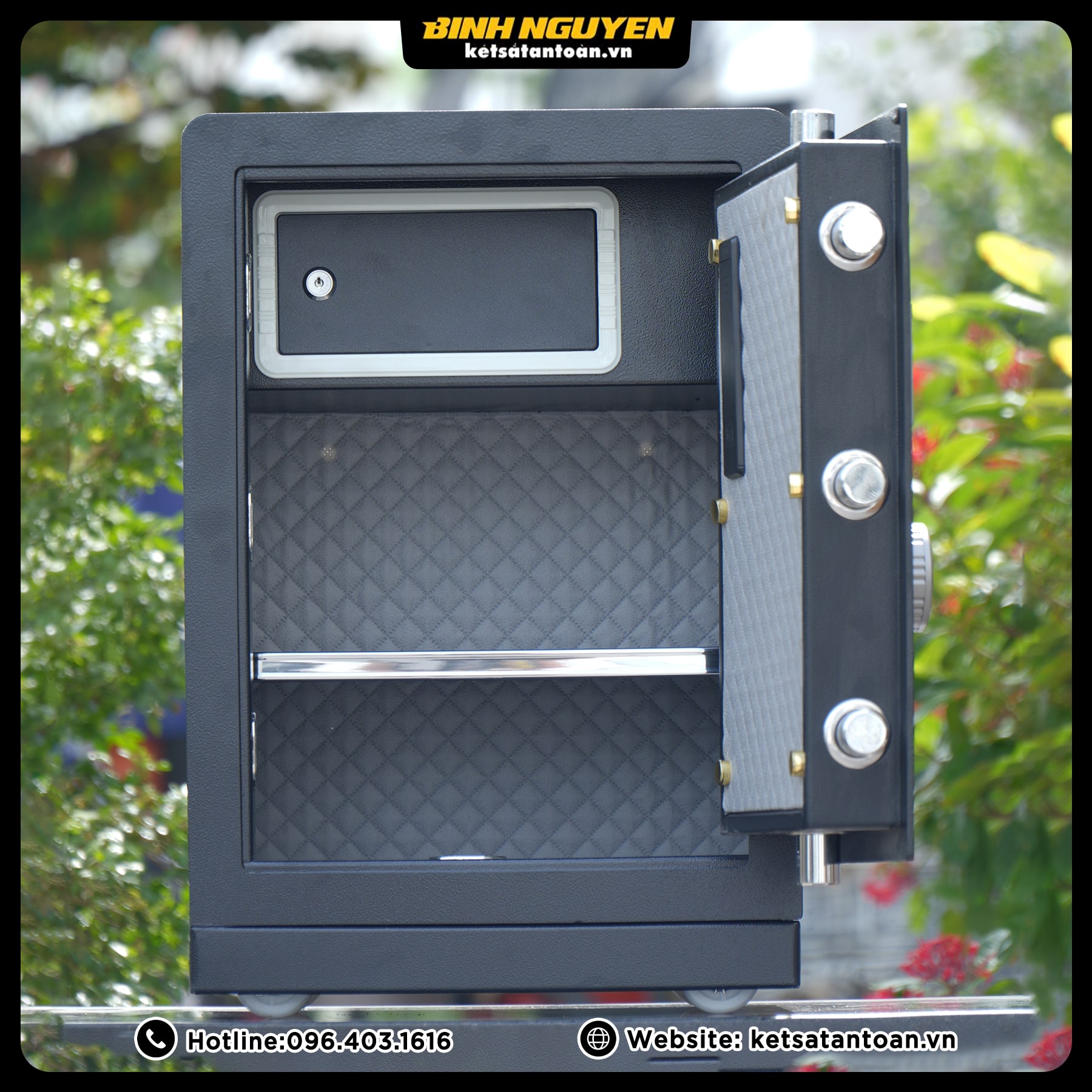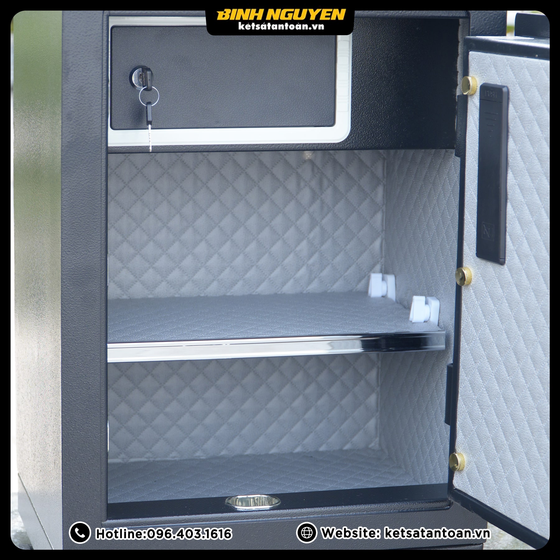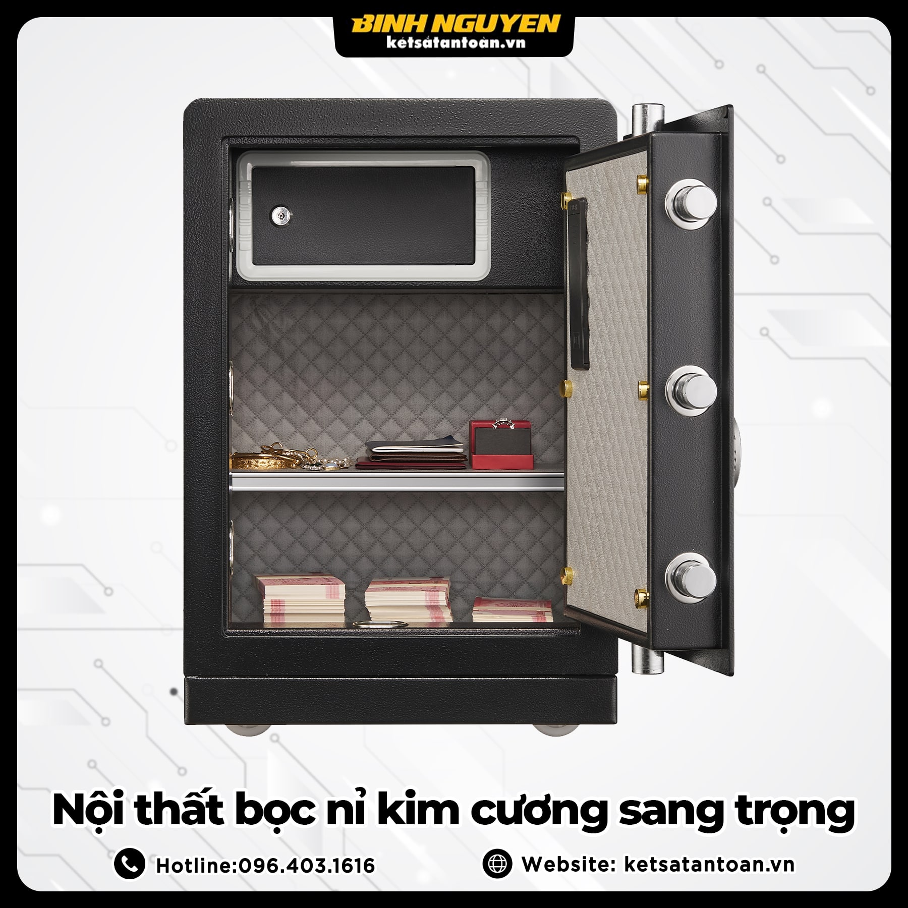 • Nội thất bọc nỉ kim cương cao cấp: Êm – mềm – sang trọng – chống trầy tối đa cho vàng, đồng hồ, trang sức. → Cảm giác mở két như mở tủ trưng bày cao cấp.