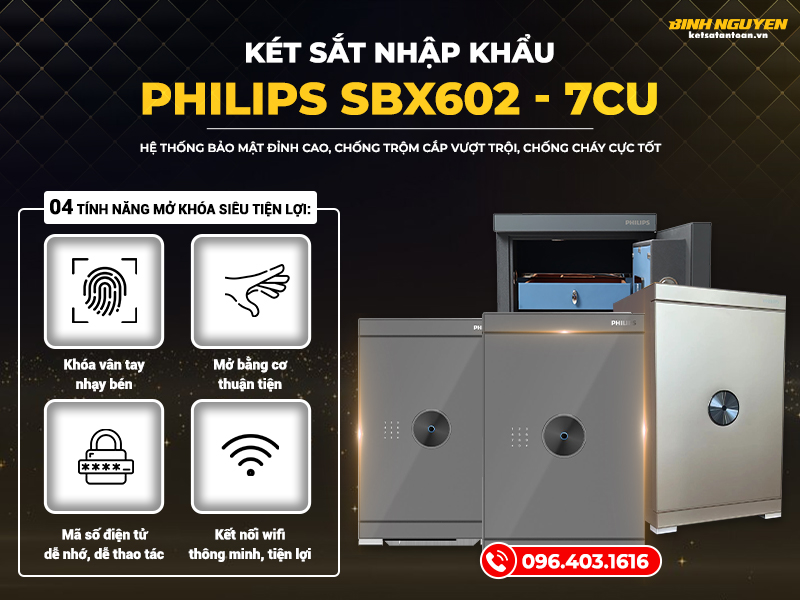 Gọi ngay cho Két sắt Bình Nguyên qua Hotline: 096.403.1616 đặt mua két sắt nhập khẩu Philips SBX 602 – 7CU vân tay điện tử thông minh, kết nối điện thoại giá tốt nhất thị trường. Chúng tôi cam kết mang đến sản phẩm chính hãng, chất lượng cao, bạn hoàn toàn an tâm khi lựa chọn sử dụng đáp ứng nhu cầu của mình.