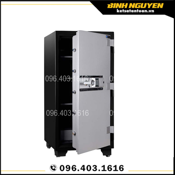 Cấu tạo chắc chắn từ thép đúc, cánh cửa 1 thép dày 12mm hèm tam cấp đóng sát thân nên khe hẹp nhỏ. Chốt khóa tròn đúc đặc ăn sâu vào lòng két chống tác động từ bên ngoài.