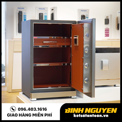 Bên trong với hệ thống chốt khóa tròn phi 32 4 chiều ăn sâu vào lòng két chắc chắn tuyệt đối. 1 đợt cố định chia 3 ngăn, 1 ngăn kéo, 1 ngăn bí mật vô cùng rộng rãi giúp việc cất giữ tài sản tốt nhất, Toàn bộ nội thất được bọc da cao cấp, chống ẩm, chống trầy xước tốt nhất,