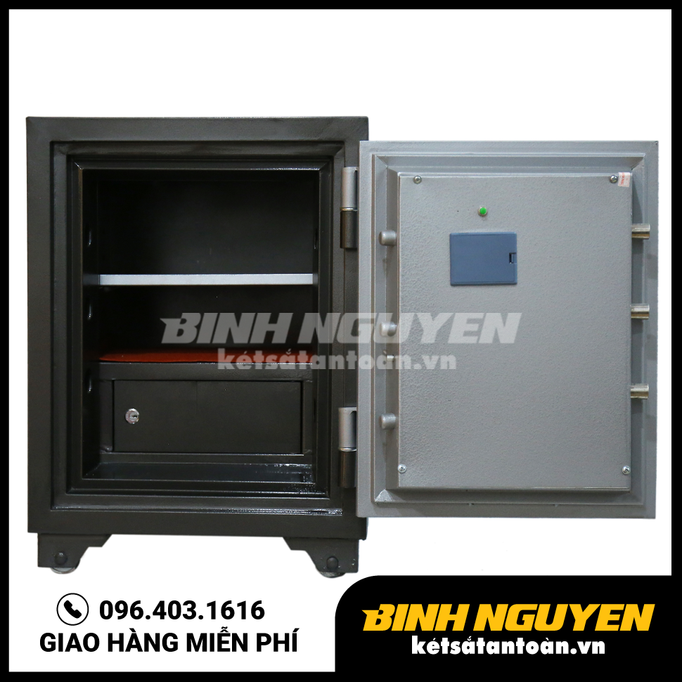Két sắt có kết cấu an toàn vững chắc, thân két sắt được đúc đặc bởi 1 lớp thép dầy bên trong két sắt được bao bọc bới một lớp bốt chống cháy và bê tông xốp chống cháy