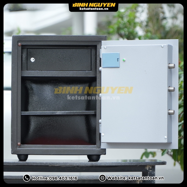 Nhìn hình dáng két bên ngoài tuy nhỏ gọn nhưng. Bên trong lòng két sắt ở phía trên có 1 ngăn kéo con có khóa riêng biệt phía dưới là khoảng không gian giúp bạn để giấy tờ A4, Sổ đỏ nhà đất, túi clear bag, laptop bởi kích thước bên trong rất rộng ( cao 47 rộng 36 sâu 29cm)