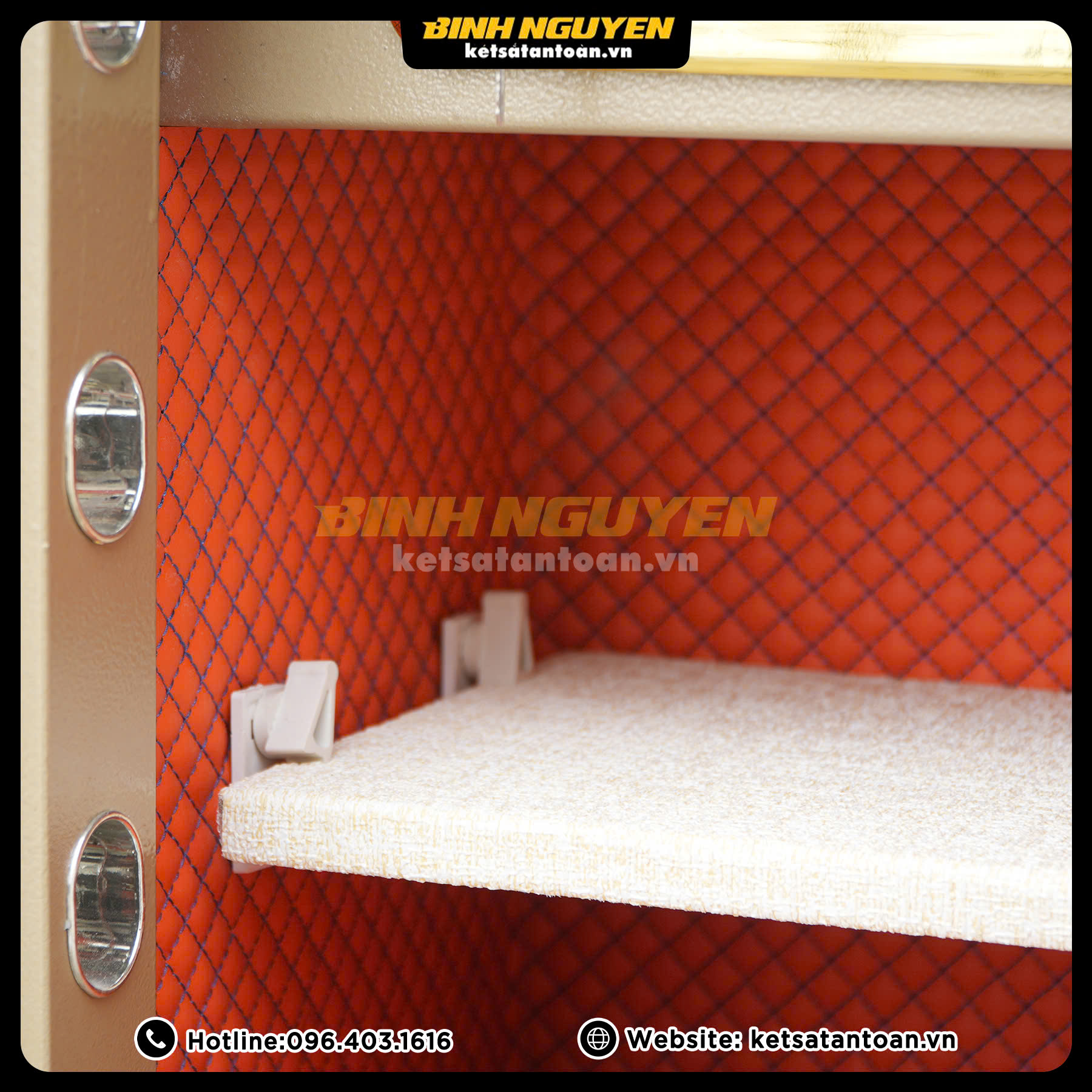 Nội thất chia thành 3 ngăn hợp lý, trong đó có một ngăn kéo có khóa riêng biệt. Bên trong két được bọc da cao cấp, có đèn chiếu sáng khi mở cửa.