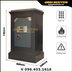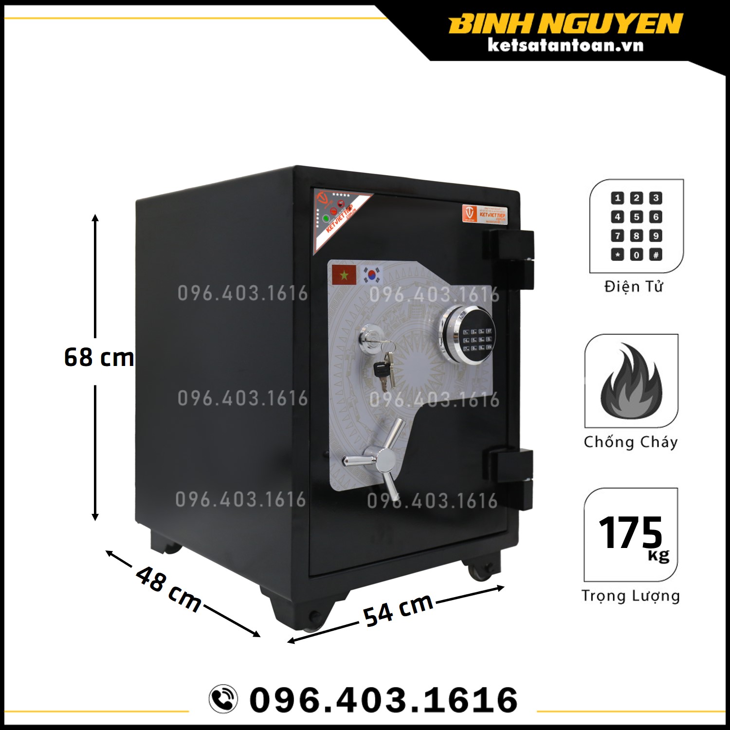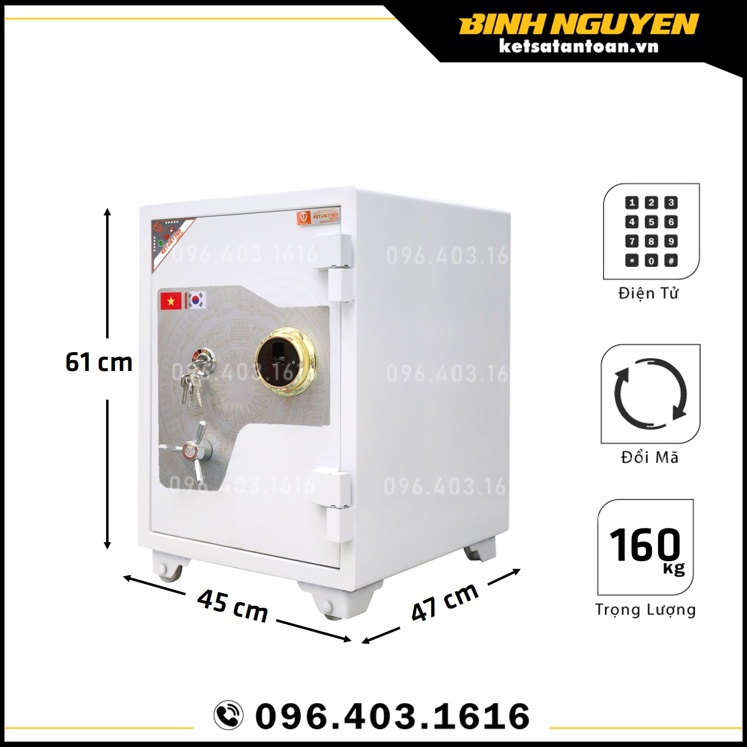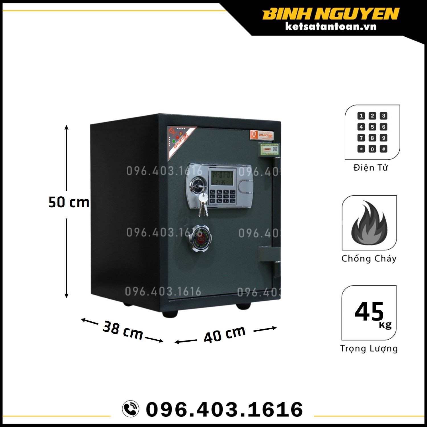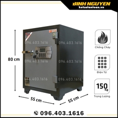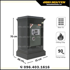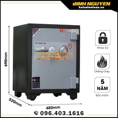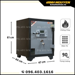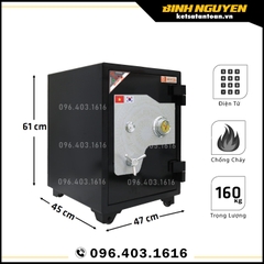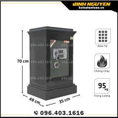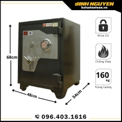Kích thước ngoài: 61x45x47cm, Trọng lượng: 160kg, Kích thước trong: 46*35*29cm, Khóa cơ, Chống Cháy, Siêu cường |