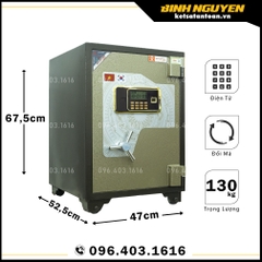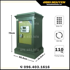 Kích thước ngoài: 69x48x50cm, Trọng lượng: 120 ±10kg, Kích thước trong: 40*35*34cm, Khóa cơ, đổi mã, chống cháy |