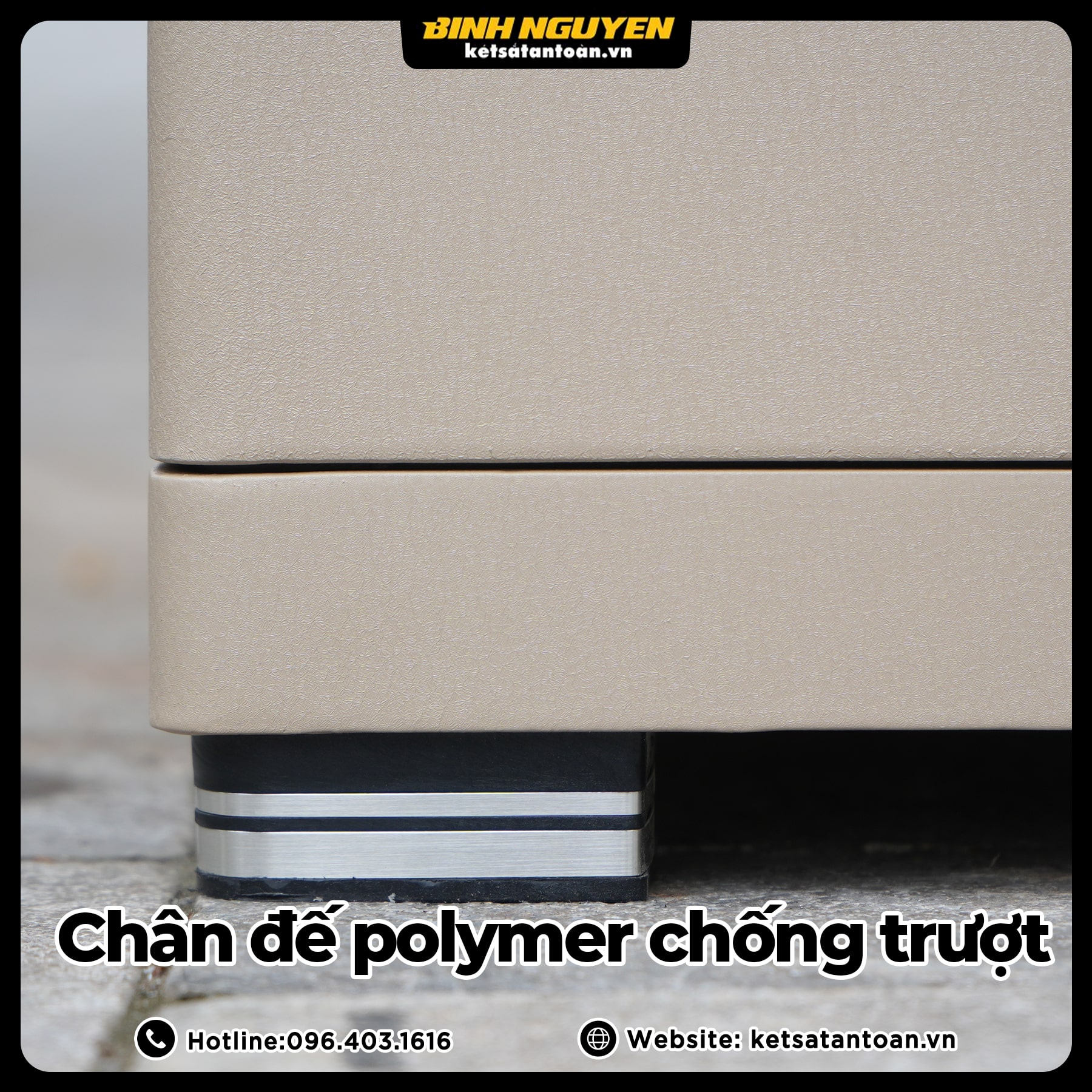 Chân két polymer bọc kim loại: Hấp thụ rung chấn, chống trượt, bảo vệ sàn, giữ két đứng vững ngay cả khi sàn rung hoặc bị tác động mạnh.