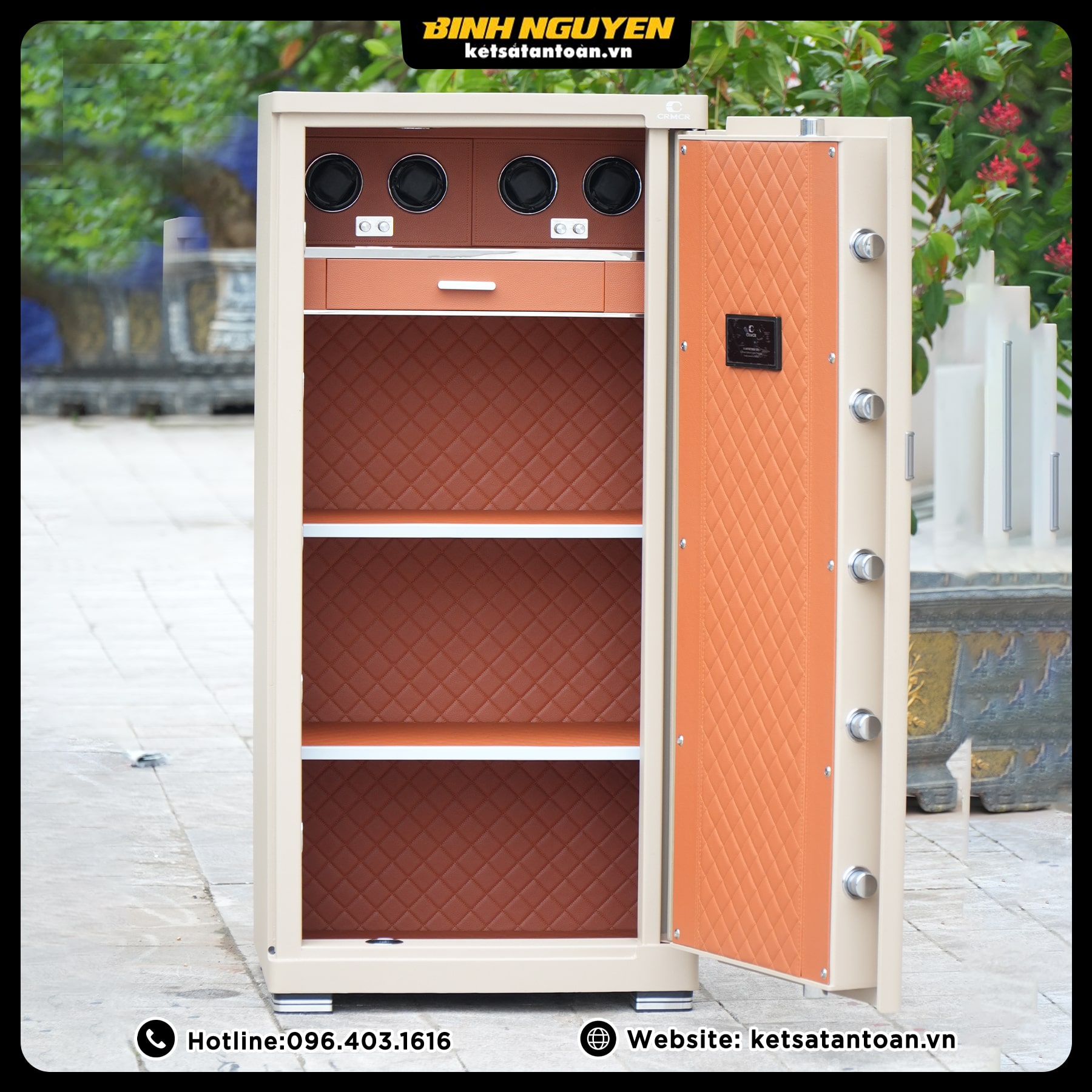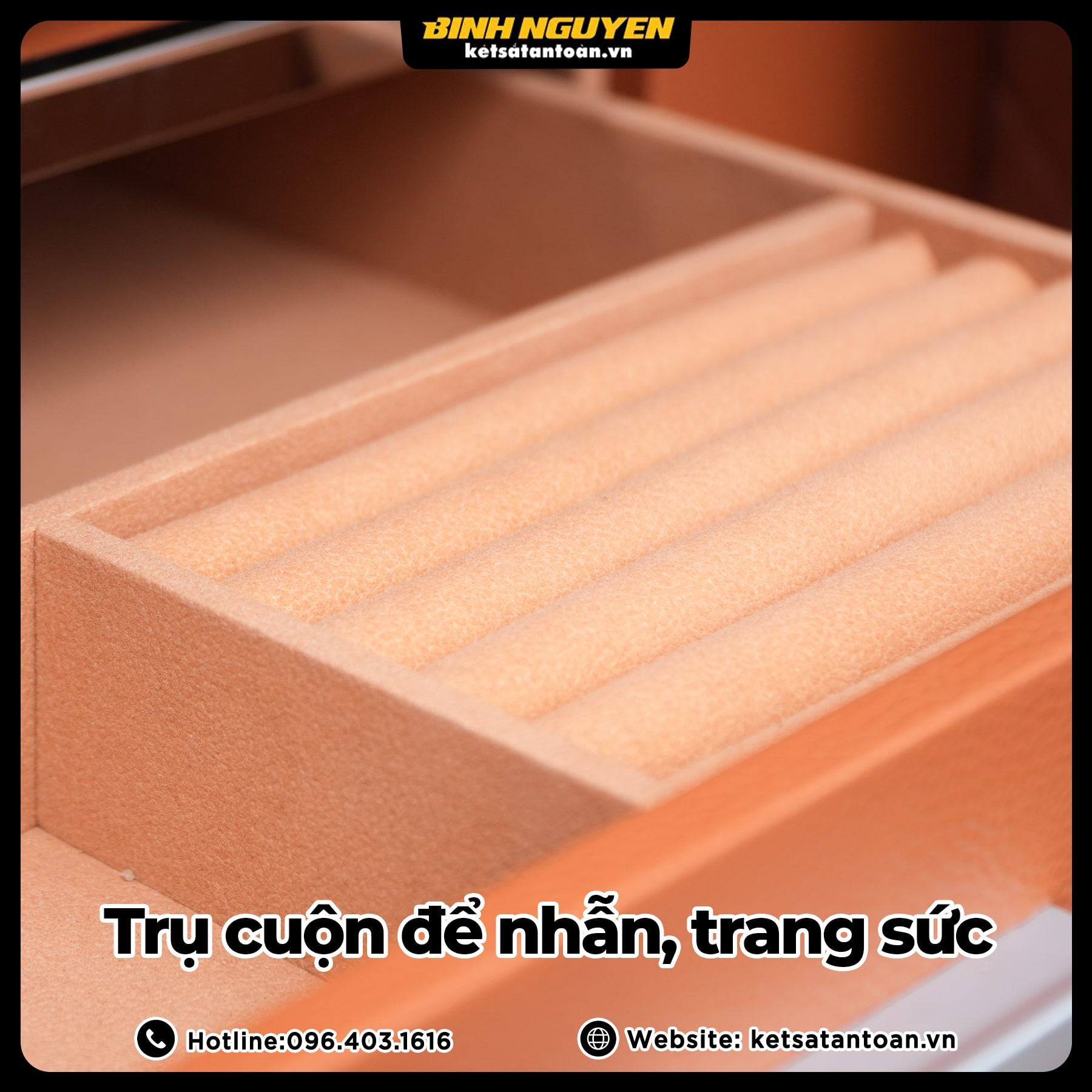 Ngăn trang sức & ngăn kéo phụ có trụ cuộn nhẫn: Thiết kế chia os hợp lý, bảo vệ từng món tài sản, trang sức quý, hạn chế va đập và tăng tính thẩm mỹ.