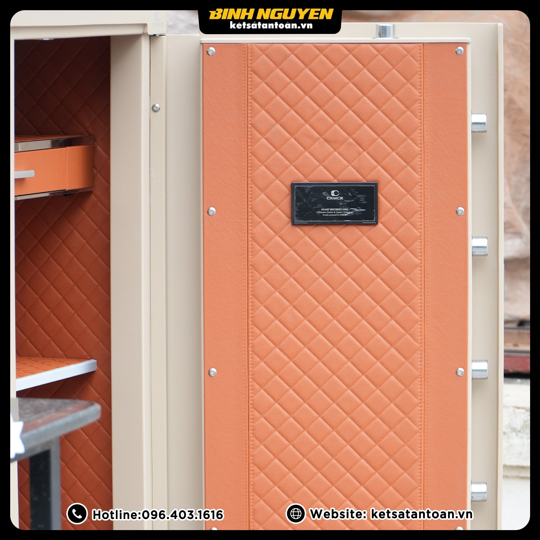 Nội thất da kim cương chuẩn khoang xe châu Âu Két thường chỉ lót nỉ. CRMCR 120JBW sử dụng da kim cương cao cấp, chia ngăn khoa học, có ngăn trang sức – sang trọng và bảo vệ tài sản tốt hơn hẳn.