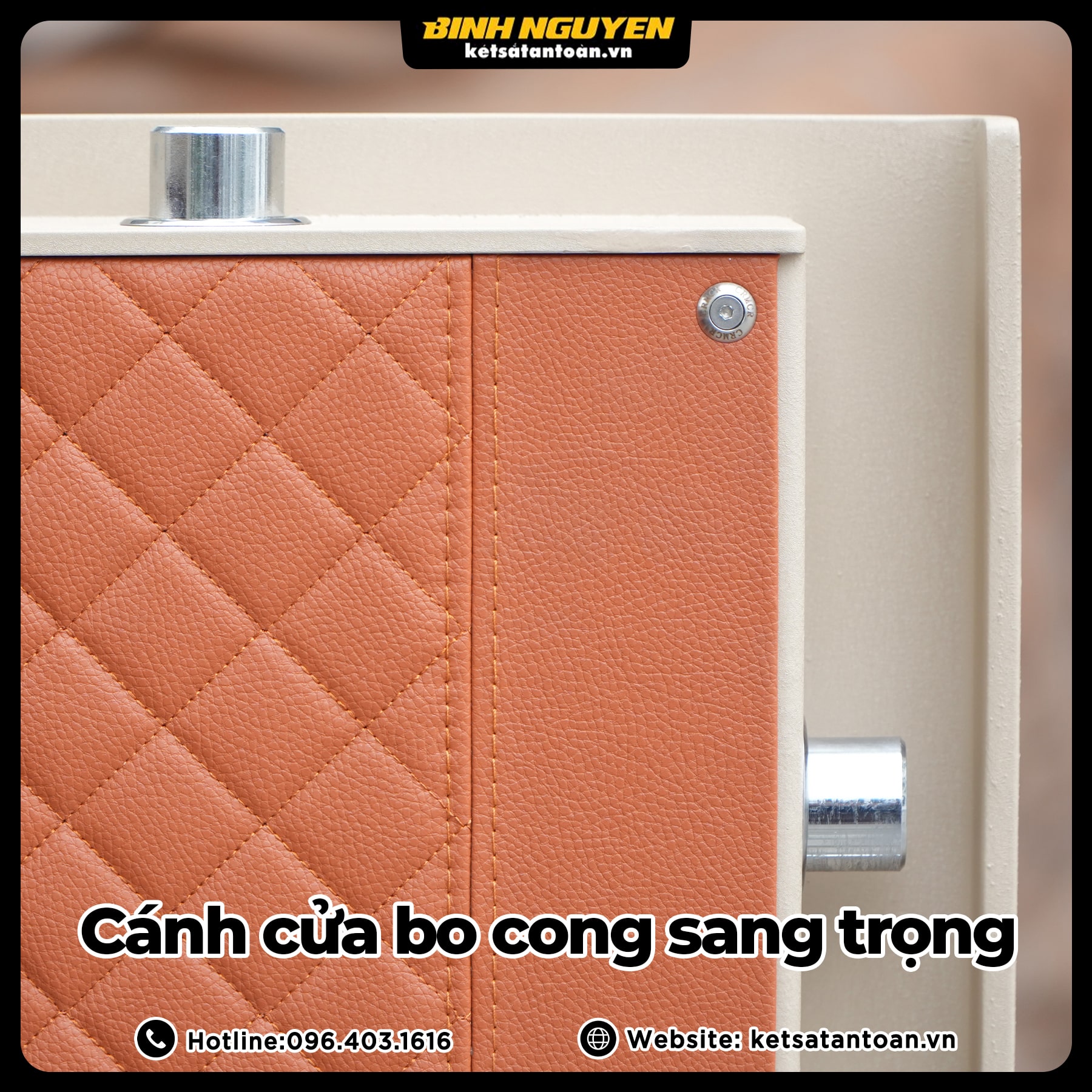 Cánh cửa két dày 8mm, thiết kế cong liền khối ôm sát thân két Độ dày gấp 6–8 lần két thường; cấu trúc cong cho khe hở gần như bằng 0, tăng khả năng kháng nạy đòn bẩy, đồng thời tạo tiếng “khớp” chắc nịch khi đóng.