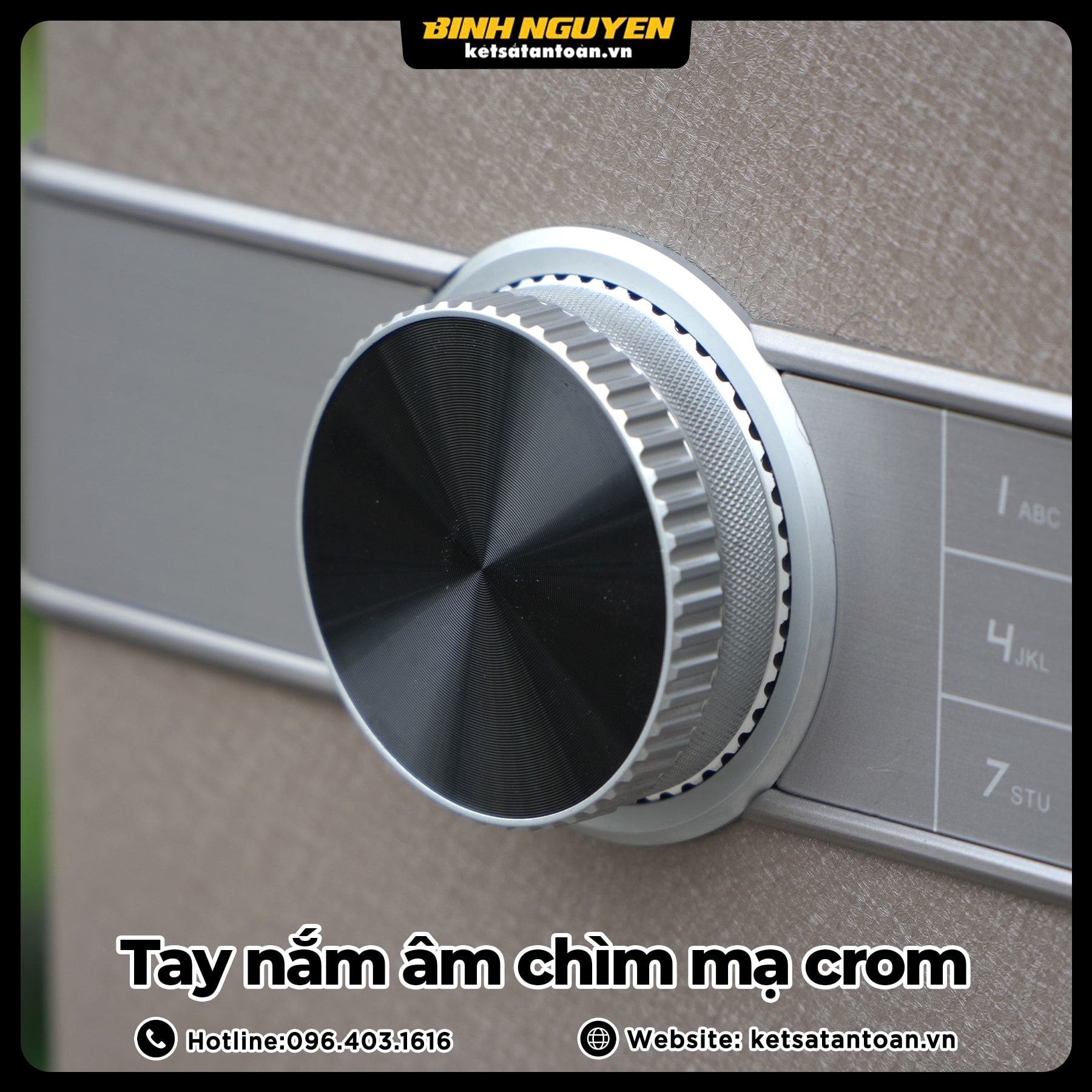 Tay nắm xoay âm chìm bằng hợp kim nguyên khối cho cảm giác xoay êm, chắc và chuẩn xác từng milimét. Từng ốc vít thép không gỉ được khắc laser logo CRMCR, thể hiện tiêu chuẩn sản xuất cao hiếm dòng két nào có. Khi không sử dụng, tay nắm phẳng tuyệt đối, tạo sự liền mạch – một chuẩn mực thẩm mỹ của các dòng két cao cấp.