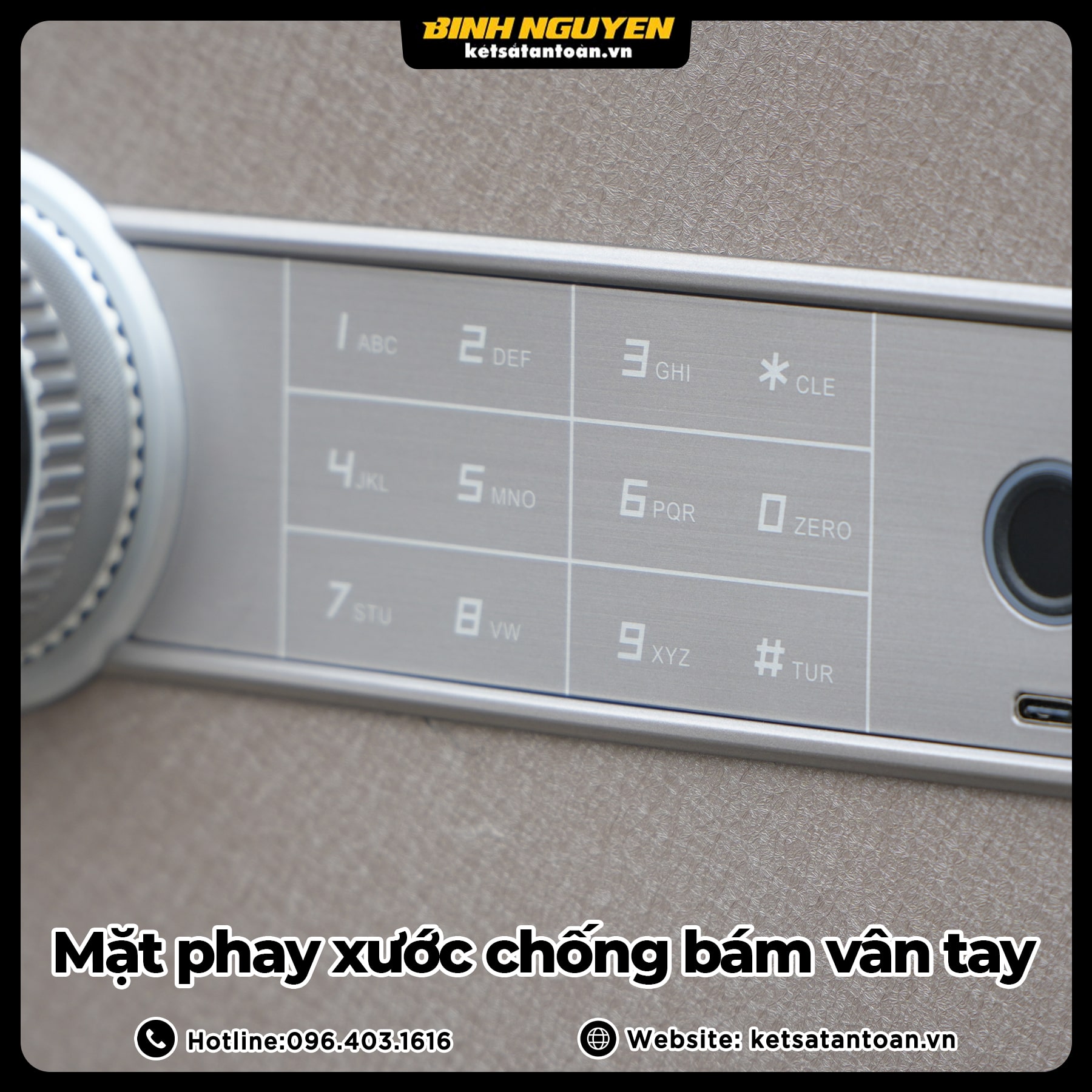 Mở két bằng mã số điện tử linh hoạt, cho phép cài đặt 3–8 ký tự, đổi mã không giới hạn và đặc biệt có tính năng mật khẩu ảo, chỉ cần nhập thêm chuỗi số trước hoặc sau mật khẩu chính (ví dụ 1234 – mã chính – 5678) mà két vẫn mở bình thường, giúp tránh bị nhìn trộm khi có người đứng cạnh.