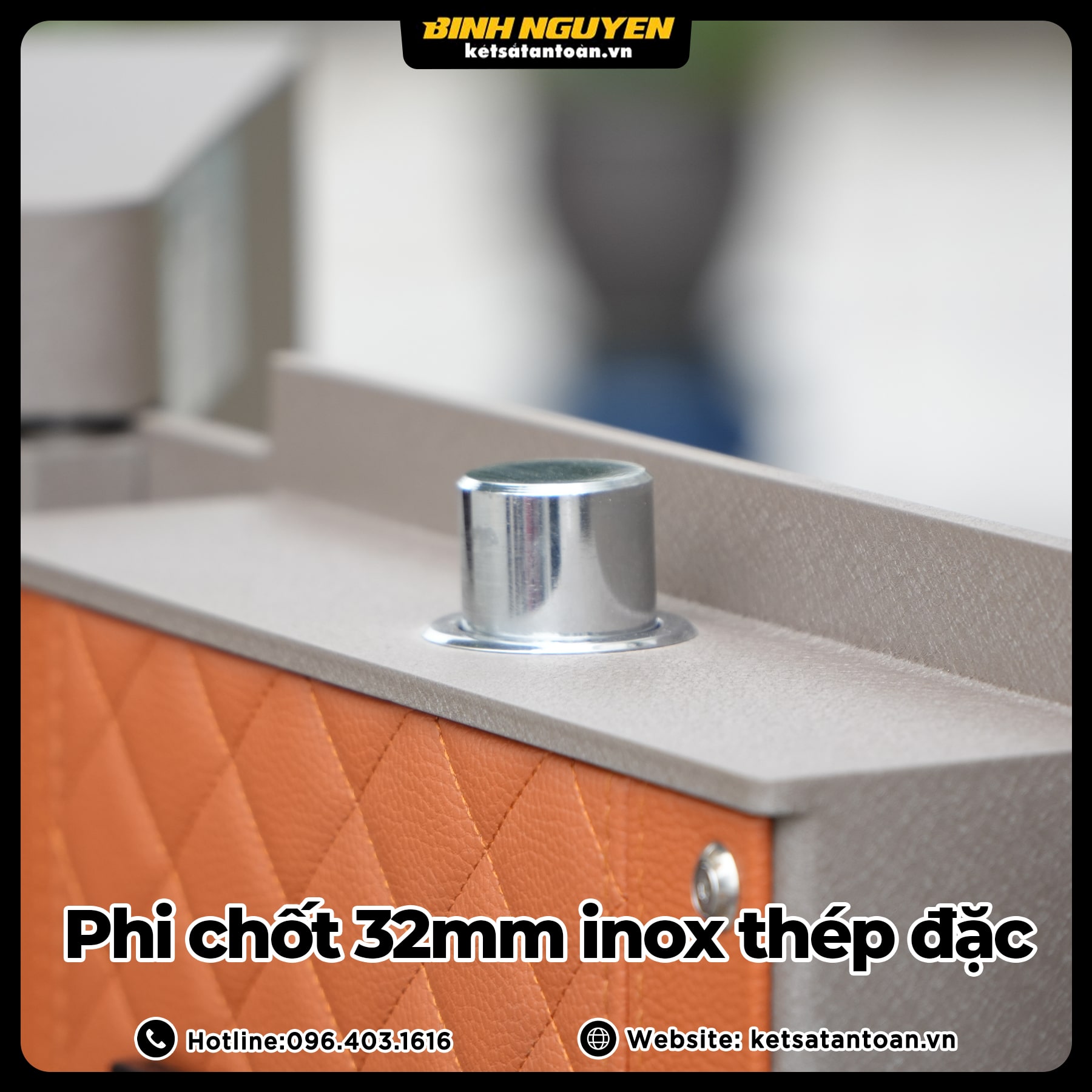 Thân két đúc đặc nguyên khối thép Q345, không mối hàn, chống khoan – chống cạy – chống phá cực mạnh. Cửa két dày 8mm thiết kế cong ôm khít, tạo thành liên kết vững chắc hơn hẳn cửa phẳng của các dòng két giá rẻ. Hệ thống 5 chốt thép đặc phi 3.2cm, ăn sâu 3.8cm vào lòng két → khó bật cửa, khó cạy, khó đòn bẩy.