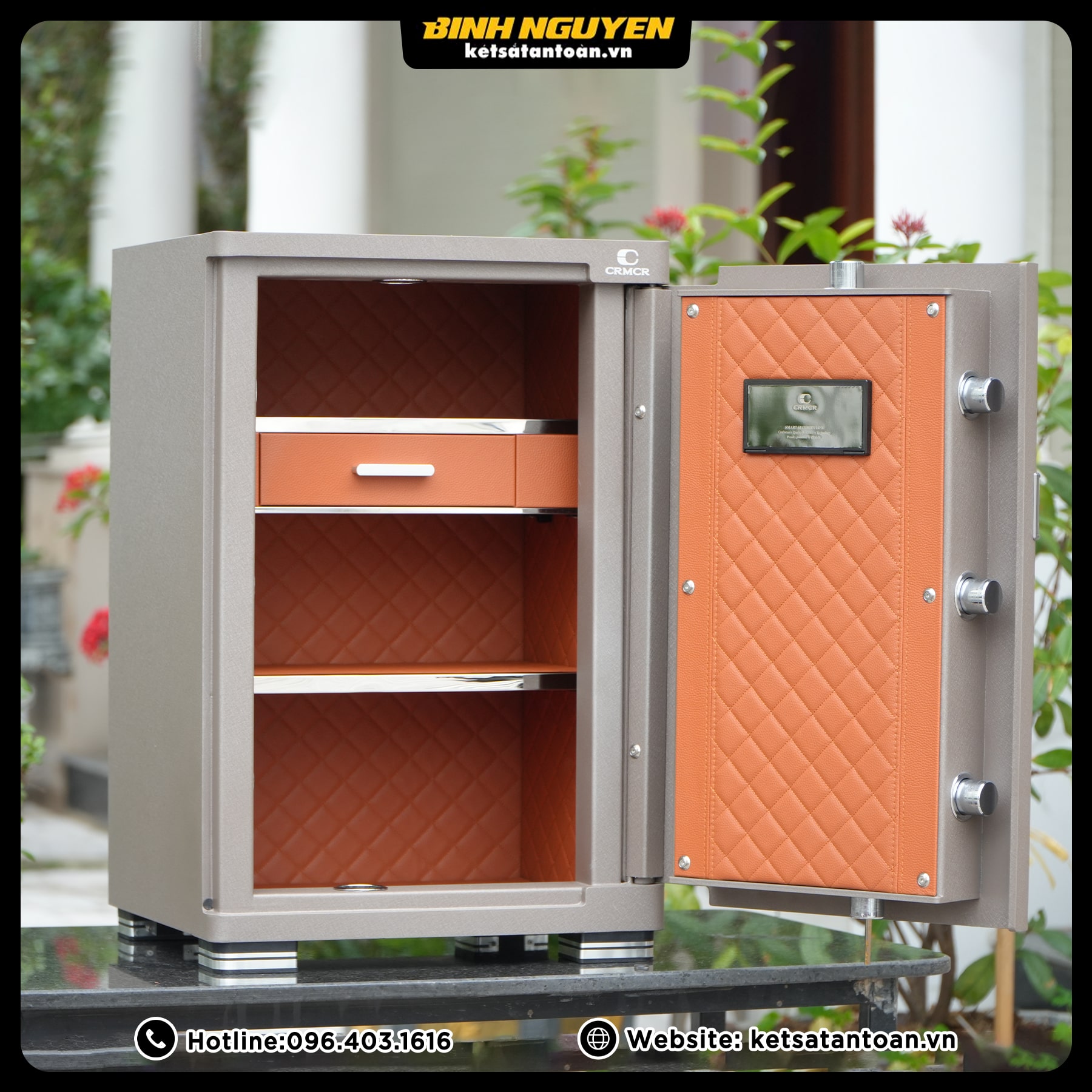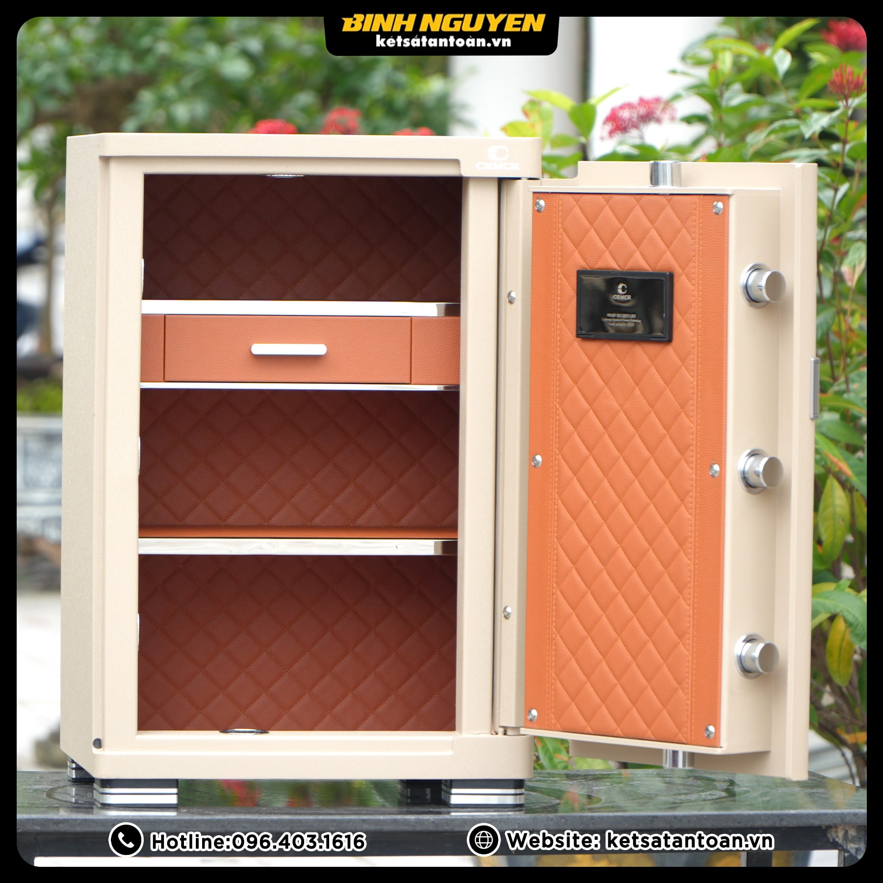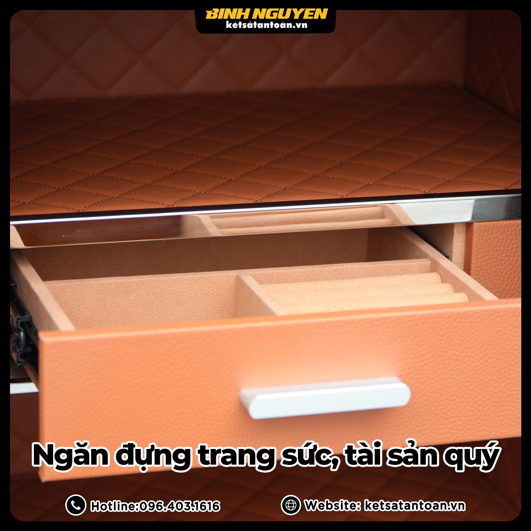 Bên trong két được bọc da họa tiết kim cương toàn bộ, tạo cảm giác sang trọng và bảo vệ trang sức, đồng hồ, giấy tờ khỏi trầy xước.Ngăn trang sức chia ô khoa học, có trụ cuộn riêng cho nhẫn – trang sức quý, giúp người dùng sắp xếp tài sản khoa học và đẹp mắt. Đây là ưu điểm thể hiện rõ sự khác biệt so với két truyền thống chỉ dùng tôn trơn hoặc nỉ mỏng.